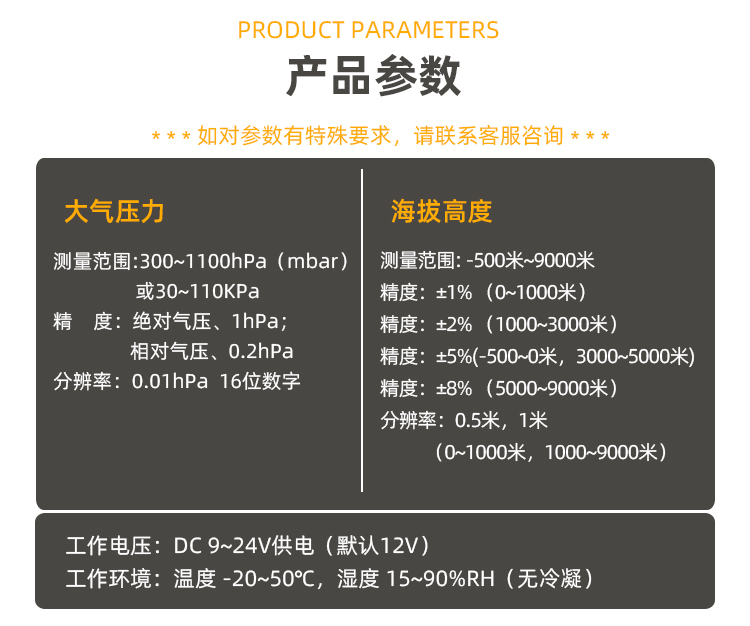 技術指標大氣壓力海拔高度氣壓測量范圍:300~1100hPa(mbar)或30~110KPa精 度:絕對氣壓、1hPa;相對氣壓、0.2hPa分辨率:0.01hPa 16位數字漂移···