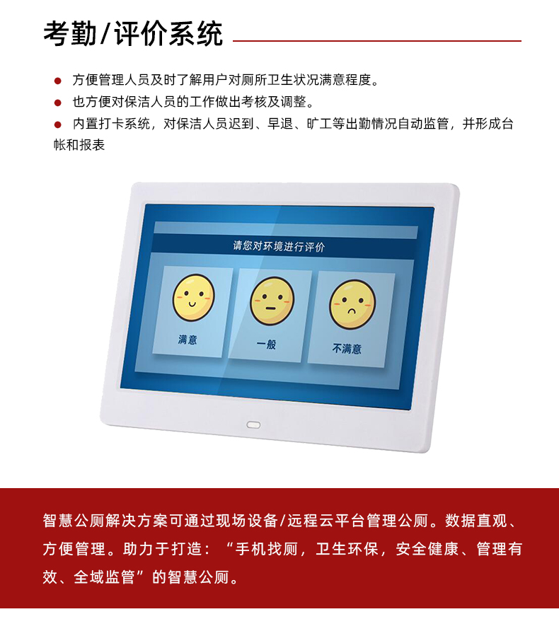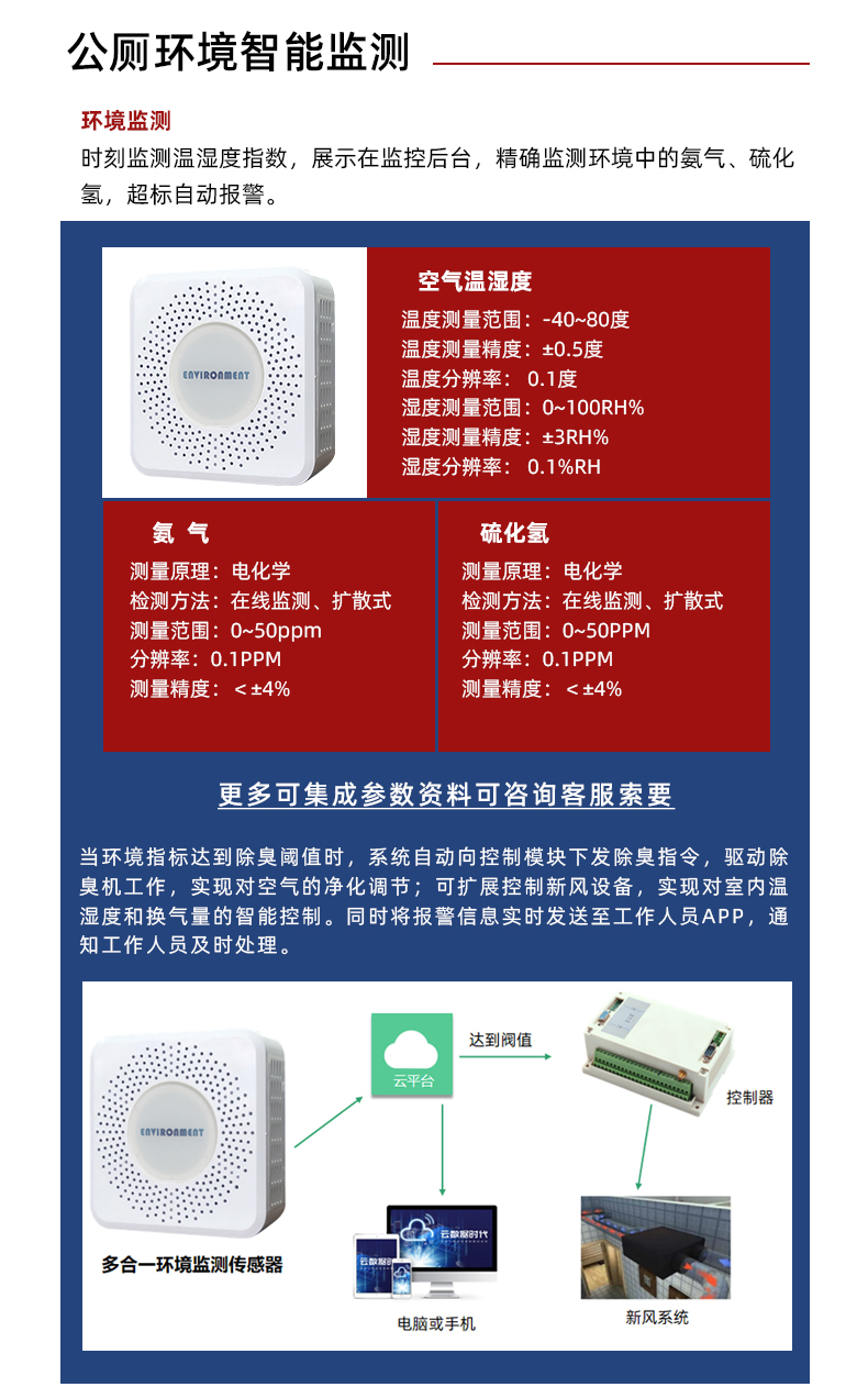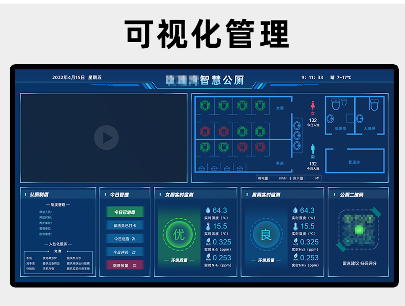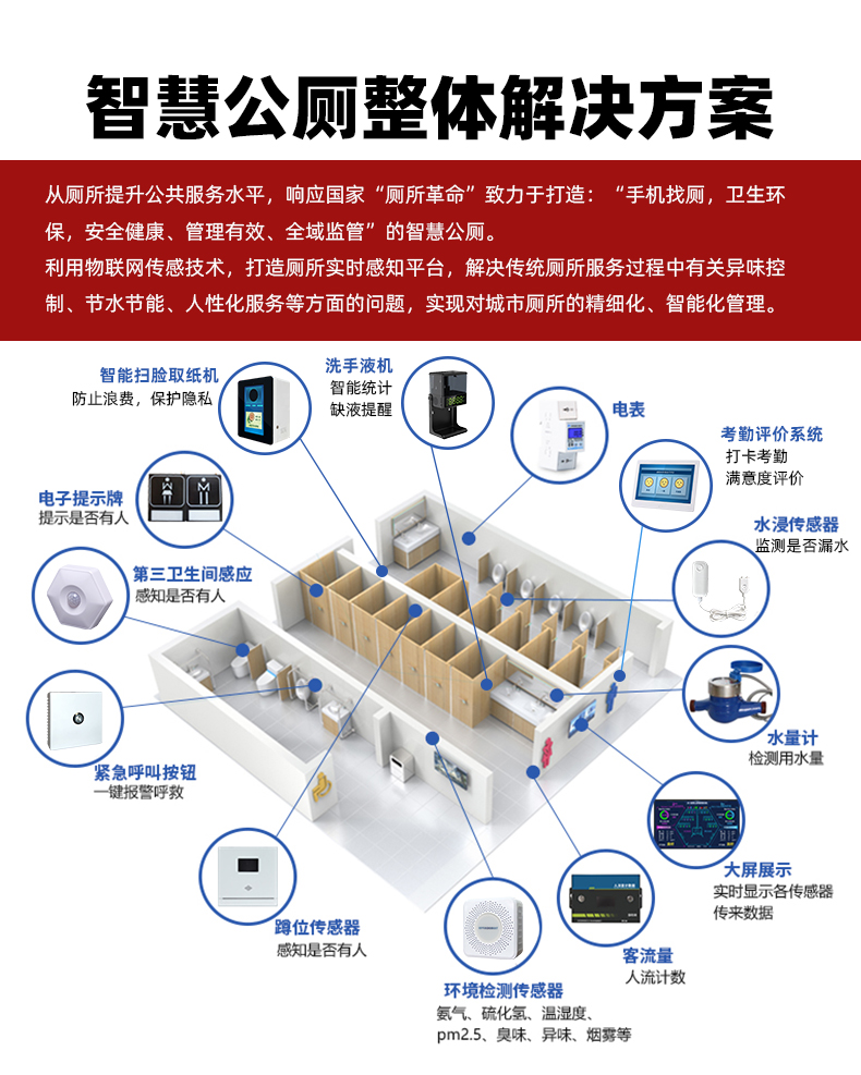 摘要:智慧廁所系統(tǒng)采用最新物聯(lián)網(wǎng)技術(shù)。主要由三部分構(gòu)成:感知層、傳輸層、應(yīng)用層。集異味氣體探測(cè)、客流量、蹲位、公廁引導(dǎo)組成。通過環(huán)境傳感器采集公廁環(huán)境實(shí)時(shí)數(shù)據(jù)實(shí)時(shí)上傳至云平臺(tái)。大屏顯示公廁環(huán)境參數(shù),異味超標(biāo)實(shí)時(shí)預(yù)警,同時(shí)接入移動(dòng)端。實(shí)現(xiàn)現(xiàn)代化,信息化,自動(dòng)化,智能化的“智慧廁所”。響應(yīng)號(hào)召全面建設(shè)現(xiàn)代新都市。